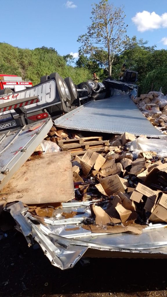 Caminhão que carregava garrafas de conhaque capota na BR-393