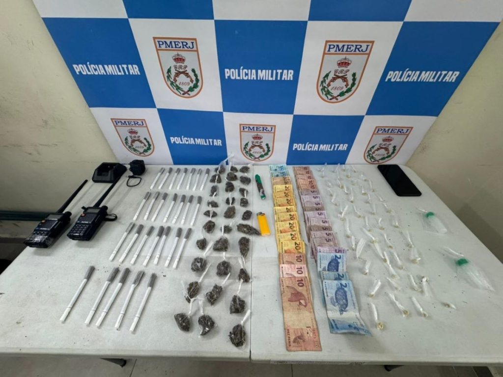 Foram apreendidos R$ 596 em dinheiro, 46 pedras de crack, 31 tiras de maconha, dois frascos de loló, um celular e um rádio comunicador.