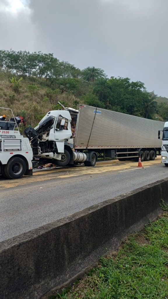 Engavetamento entre três carretas deixa ferido na Via Dutra, em Barra Mansa