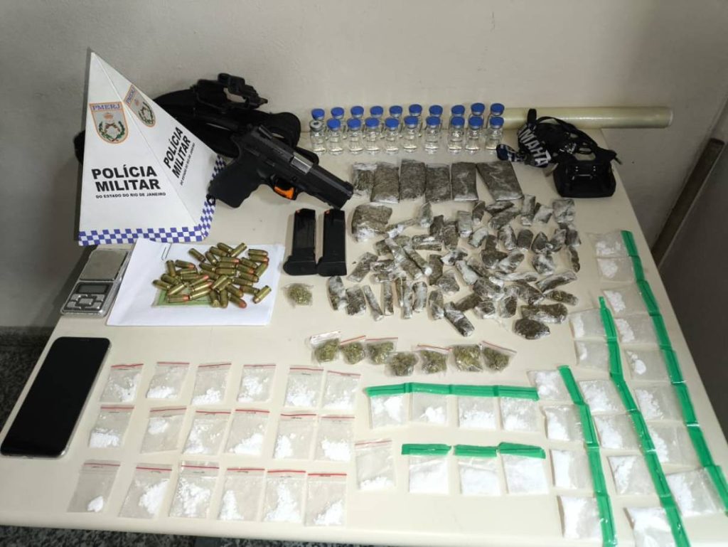 Um jovem de 19 anos foi preso em flagrante com uma arma de fogo, drogas e diversos materiais usados na atividade criminosa na noite de sábado (8) em Paraty (RJ). A prisão aconteceu durante uma operação de repressão ao tráfico no bairro Ilha das Cobras, por volta das 20h.