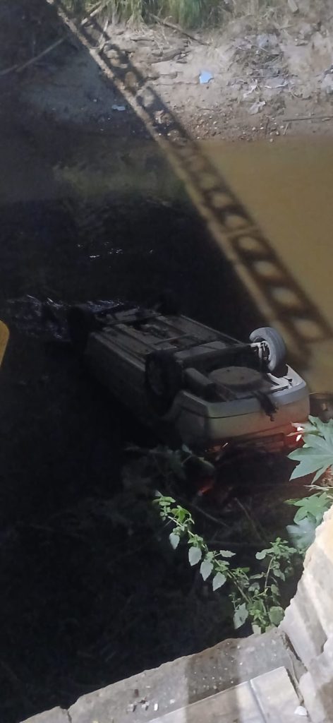 Em imagens que circulam pelas redes sociais, é possível ver o carro dentro do rio e parte da contenção do trecho quebrada.