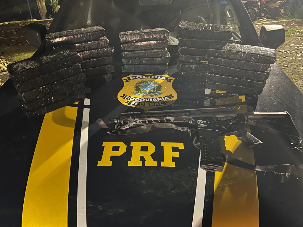 Durante a revista do veículo, os agentes encontraram um fuzil, carregador para a arma e cerca de 27kg de maconha em tabletes.
