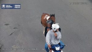 Câmera da Ordem Publica flagra cavalo sendo puxado por moto em Volta Redonda Divulgação/Semop Dois jovens foram flagrados puxando um cavalo em uma moto na